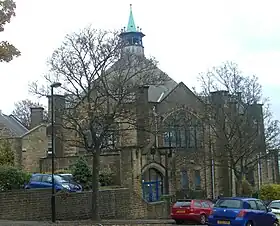 In 1907 Hale completed another commission for the Sheffield Education Committee. Lydgate Lane Council School at Crosspool was a continuation of the Arts and Crafts style used successfully at Hammerton Street, but the school was no duplicate and has a distinctive design built in gritstone from the Bole Hill or Bell Hagg quarries.[7] In 1908 Hale became involved in the design of Victoria Hall in central Sheffield. He had finished second in a competition to design the building to the firm of Waddington, Son and Dunkerley, but after the death of the original architect, William Angelo Waddington, in January 1907, Hale took over. The extent of Hale's alterations to the original plans is unclear, but the tower and its uppermost elevations were considerably changed.[8]