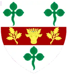 Argent on a fess Gules between three trefoils Vert a buffalo's head caboshed and crowned between two oak sprigs fructed Or.