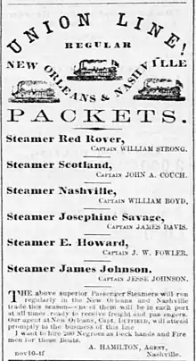 ![]() "Union Line! Regular New Orleans & Nashville Packets" – Steamer Nashville, Captain William Boyd – Daily Nashville Patriot, December 13, 1858 | |