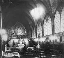 Interior view of Corpus Christie Chapel showing Harris's decorations "echoing and balancing one another in well defined color harmony."