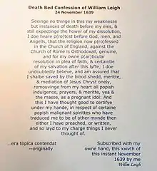Written two days before his death at age 89, Leigh proclaims before "God, men, and angels" that the Church of England embodies the true Christian religion. Dying, he remains certain of his salvation in the afterlife.