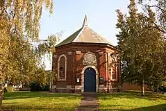 - Moulton Chapel, St James Moulton. The original church is brick and octagonal in form. Each side of the octagon has a pair of giant pilasters of the Doric order, similar to the pilasters on the façade of Fydell House. The doorway and widows are arched and the interior has a domed roof. A baroque date inscription is present. The Spalding Gentlemen's Society has a drawing by John Talman showing that the architect had originally intended to surmount the building with a cupola.[5] It can be compared with the less ornate octagon Preskbyterian and later Unitarian Octagon Chapel of 1756 in Norwich, which is thought to have been inspired by the architecture of the Low Countries.[6]