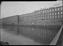 William Skinner & Sons, generally sold under the names Skinner's Satin, Skinner's Silk, and Skinner Fabrics, was an American textile manufacturer specializing in silk products, specifically woven satins with mills in Holyoke, main sales offices in New York, and a series of nationwide satellite offices in Boston, Chicago, Philadelphia, Baltimore, Cincinnati, Cleveland, Minneapolis, Rochester, and St. Louis.[2] Founded in 1848 by William Skinner as a partnership between himself and his brother-in-law at that time, the company was first established at a long-term location in Haydenville in 1854, as the Unquomonk Silk Mills. Following the Mill River Flood of 1874, Skinner relocated both his home and company to new facilities in Holyoke, Massachusetts, where the company would maintain its mills for the remainder of its existence. By the 20th century, Skinner & Sons had become the largest manufacturer of satins in the world, becoming one of the first to directly market to consumers in 1903, and operated out of the largest silk mill under one roof by 1912.[3][4] During the 1920s and 1930s the brand was popularized with its usage in Hollywood, with silk gowns made from its satins adorned by such stars as Joan Crawford and Bette Davis on the silver screen. The company would also work extensively with the US Armed Forces during the Second World War, developing improved silk and other textile parachutes.[5] Following a period of decline due in part to an increasingly competitive world market, the Skinner family and other shareholders sold the company for an undisclosed amount on January 26, 1961 to Indian Head Mills, which continued to operate the mills for converting rayon and other synthetics until the closure of the plant as a textile mill in 1963.[6][7] In the 1970s, the Finished Goods Division of Indian Head was acquired by Springs Global, which used the Skinner name, marketing, and product line until the late 1980s; it has been defunct since that time.[8]