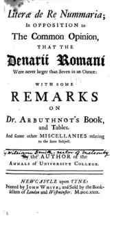 - ↑ The book referred to in the title is John Arbuthnot's Tables of Ancient Coins, Weights and Measures.