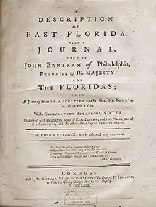 His An Account of East Florida, written in English, was published in three editions, two in 1766, subtitled "With Remark on its Future Importance to Trade and Commerce" and a third in 1769, as A description of East-Florida, subtitled "with a journal kept by John Bartram of Philadelphia, botanist to His Majesty for the Floridas : upon a journey from St. Augustine up the river St. John's, as far as the lakes : with explanatory botanical notes, illustrated with an accurate map of East-Florida, and two plans, one of St. Augustine, and the other of the Bay of Espiritu Santo", the latter referring to St. Augustine, Florida, St. Johns River, the bay now known as Tampa Bay, and the botanist John Bartram.[3]