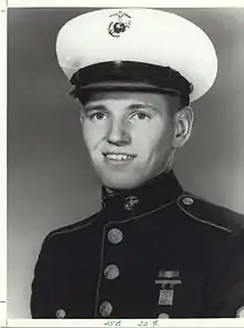 Upon completion of recruit training with the 2nd Recruit Training Battalion, Marine Corps Recruit Depot, San Diego, he was promoted to private first class on September 22, 1966. Transferred to the Marine Corps Base, Camp Pendleton, he underwent individual combat training with the 3rd Battalion, 2nd Infantry Training Regiment.[1]