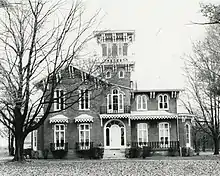 The William Treadwell House is a two-story brick Italian Villa structure on a cut stone foundation.[2] Two bays balance the main mass of the house, and it is surmounted by a gable roof. External architectural embellishments include elaborate brackets, wrought iron railings, rounded arch windows and doorways, and a two-tiered, square tower. Although the interior has been extensively altered, the exterior remains original.