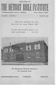 The college opened its doors in September 1945 as the Detroit Bible Institute, organized by the Christian Business Men's Committee of Detroit. Classes were held in the Missionary Workers Tabernacle and later at Highland Park Baptist Church and Elim Baptist Church until the first campus was built at 17370 Meyers Road in northwest Detroit in 1950. The institute became a bachelor-degree-granting college in 1960. In 1976, the college sold its Meyers Road campus to Lewis College of Business and moved to a temporary location in a former elementary school on Franklin Road in Southfield. DBC relocated to newly built facilities on a 28-acre campus at 35700 W. Twelve Mile Road in Farmington Hills, Michigan, in 1978. As a means of maintaining its historic connection with urban churches in Detroit following its move to suburban Oakland County, the college began offering undergraduate courses in Urban Ministry as well as non-credit continuing education courses at Greater New Mt Moriah Baptist Church. In 1981 Detroit Bible College changed its name to William Tyndale College.[1] In 1993 the continuing education component became Tyndale Bible Institute, offering a Bible Base Curriculum, in eight Metro-Detroit churches.[2]