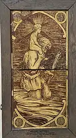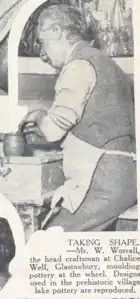 Worrall's years in Glastonbury were productive, and he demonstrated a move away from fabric design. He trained in pottery making under the renowned Bernard Leach, and Leach later named him as one of his principal students.[13] In 1931, Worrall was invited to demonstrate pottery techniques at the Selfridges department store in London,[14] and featured in an article in the American newspaper, Evening World.[15] He also became skilled in tile-making and bronze-work and was an early member of the Somerset Guild of Craftsmen which exists to this day.[16][17] He was invited by the Board of Trade to submit items for the 1937 Paris Exhibition, and sent a dish, jug and beer mug for the rural industries section. The dish incorporated an image of Glastonbury Tor.[18][19][20] He became further known when he was commissioned to make a memorial of bronze set in stone to the famous Somerset author Walter Raymond, which was placed, and still is, in Yeovil Library.[21] He also notably designed the renovations of St Margaret's Almshouses in Taunton,[22] and played a significant role in life at Chalice Well in Glastonbury, being a member of that group's dramatic circle which performed plays, and he created the required stage scenery. He became very knowledgeable about local folklore, became a member of the Avalon Sister and Brotherhood, and gave lectures on the legend of Glastonbury and the Holy Grail.[23][24][25]