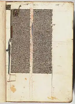 William de Brailes illuminated Bibles, psalters, a Book of hours and secular texts, and may also have been a scribe. He is associated with a distinctive style, but other artists also worked in this manner, and distinguishing his hand from theirs is difficult. The style is characterised by energetic gesticulating figures, though with a limited range of facial expression, and a concern for narrative. Ornamental bars stretch out from historiated initials to the top or sides of the text, a feature in transition from the Romanesque style to the mature Gothic style, where decorative borders run round the whole page.[4] Larger miniatures often contain different scenes in separate roundels. Most of his manuscripts have a page size similar to that of a standard modern paperback,[5] and reflect the trend towards the personal ownership of books by well off but not extravagant members of both clergy and laity.