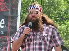 Robertson is known for his Christian faith and often preaches about it to others. He is a member of the Churches of Christ.[8] He is also almost always seen wearing a bandana in the pattern of the American flag on his head, and he often wears a white suit jacket to look more professional,[9] though the jacket has drawn comparisons to The Dukes of Hazzard character Boss Hogg (Willie's Twitter handle is "williebosshog").[10]
