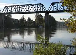 The first bridge was built in 1907 for the Oregon Electric Railway line that ran from Eugene to Portland.[1] That bridge was a steel, 2,430-foot (740 m) long structure slightly downriver from the Boones Ferry crossing at a section of the Willamette that runs east-west between Canby and Newberg.[1] Known as the Oregon Electric Wilsonville Bridge, the bridge had a southern approach consisting of a wooden trestle measuring more than 2,600 feet (790 m) in length.[2] This trestle caught fire in July 1939.[3]