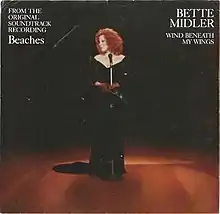 "Wind Beneath My Wings" was performed by Bette Midler for the soundtrack of the 1988 film Beaches, starring Midler and Barbara Hershey. Marc Shaiman, Midler's longtime music arranger, was already a fan of the song and suggested it to her when they were identifying songs she could perform during the film.[4] The song was named Record of the Year and Song of the Year at the Grammy Awards of 1990. The song became a worldwide hit; it charted at No. 5 in the UK, No. 2 in Iceland, No. 4 in New Zealand, and No. 1 in the United States and Australia. Midler performed the song with the fictional character Krusty the Clown on season 4 episode 22 of The Simpsons in 1993. In the days following the September 11 attacks in 2001, she performed the song live at the Prayer for America memorial service held at Yankee Stadium.[24] In 2014, Midler performed the song following the annual in memoriam montage at the 86th Academy Awards.[25]