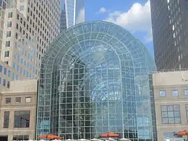 The pedestrian bridge was destroyed in the same attacks and was initially replaced by windows facing the former site of the World Trade Center.[7] In 2013, the site of the former pedestrian bridge was partially replaced with a large glass atrium, primarily serving as the entrance to an underground tunnel concourse leading to the World Trade Center PATH station. Preliminary plans called for the demolition of the Grand Staircase, which was the main focal entry point to the former pedestrian bridge. The Grand Staircase has also been used as an amphitheater; thus, the plans for demolition had outraged residents, who promptly appealed for its preservation.[8][9]