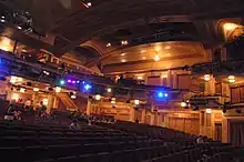 The orchestra floor is raked.[36] The rear (north) end of the orchestra contains a shallow promenade, which wraps around to the auditorium's sides. Pilasters with Corinthian capitals divide the promenade's rear wall into sections, and a cornice with dentils and modillions also runs along the wall, above the pilasters. The promenade is separated from the orchestra seating by a row of columns, also topped by Corinthian capitals. The orchestra promenade's coved ceiling is divided by Adam-style bands with foliate decorations. Each cove has circular decorative elements at their centers, which contain coffers and swags.[37] The promenade forms part of a "grand promenade" connecting Broadway and Seventh Avenue.[23] A standing rail is placed behind the rearmost row of seats.[38] The orchestra level previously had 12 boxes extending along the sides of the auditorium.[23][39] The walls originally contained latticework, behind which were lights.[21][24] One architectural critic said that the rake of the orchestra "makes for poor visibility from most locations" due to its shallowness.[36]
