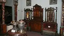 Built between 1893 and 1903, the complex is one of the few Mongolian historical attractions which have neither been destroyed by the Soviets or the Communist forces.[3] With the Winter Palace, the Gate of Peace and Happiness, the Cooling Pavilion as well as 6 temples, each containing Buddhist artwork, scripture and thangka,[4] such as Naidan Temple and Makhranz Temple, the palace complex consists of a total of about 20 structures. The museum has about 8,600 exhibits and receives over 40,000 visitors annually. On display are many of the Bogd Khan's possessions, such as his throne and bed, his collection of art and stuffed animals, his ornate ceremonial ger, a pair of ceremonial boots given to the Khan by Russian Tsar Nicholas II, and also a jewelled regalia worn by the Bogd Khan's pet elephant.[5][6] It currently runs its operations under the Ministry of Education, Culture, Science and Sports of Mongolia.