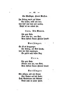 The early version began with a line "Im Anfang war’s auf Erden", describing the beginning according to the Book of Genesis 1:2. It had 16 stanzas, and a refrain that was slightly different from today's version. Claudius added his own melody to the poem.[1][2]