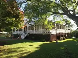 The east elevation is symmetrical, having a central entry with sidelights and fanlight and two bays with sash windows. The north elevation has a large bay below the projecting gable and the verandahs to the kitchen wing have been enclosed. French doors with fanlights open onto the verandahs, the walls of which are single skin VJ boards. A corrugated iron stove recess is located on the western end of the kitchen wing and window hoods are located on the south.[1]
