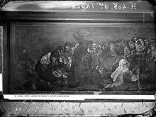 Goya went to exile in France in 1824, and ownership of the house passed to his grandson Mariano.[16] An 1830 inventory by Brugada indicates that the work took a full wall between two windows on the first floor, opposite A Pilgrimage to San Isidro.[17] On the wall to the right were Saturn Devouring His Son and Judith and Holofernes. La Leocadia, Two Old Men and Two Old Ones Eating Soup were on the left wall.[18] Art historian Lawrence Gowing observed that the lower floor was divided thematically, with a male side – Saturn and A Pilgrimage to San Isidro – and a female side – Judith and Holofernes, Witches' Sabbath and La Leocadia.[19] The house changed owners a number of times before March 1873, when it came into the possession of the Belgian Frédéric Émile d'Erlanger, who speculated that the area would appreciate in value over the coming years.[20][21] The murals had deteriorated badly after many years on the walls. To preserve them, the new owner of the house had them transferred to canvas under the direction of the art restorer of the Museo del Prado, Salvador Martínez Cubells.[22] Following their exhibition at the Paris Exposition Universelle in 1878, where they were met with little reaction, d'Erlanger donated them to the Spanish state in 1881.[23][24]