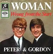 "Woman" is a 1966 single written by Paul McCartney (under the pseudonym Bernard Webb) and recorded by Peter and Gordon. McCartney intended the song to test whether one of his compositions could be successful based on its own merits without being associated with the hit-making Lennon-McCartney songwriting team, which had produced dozens of hit records for the Beatles and other acts (including Peter and Gordon). The duo's single did become a minor hit, reaching number 14 in the US and number 28 in the UK, but not before its author's true identity was publicly revealed.