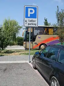 Women's parking spaces are specially designated and identified parking spaces in parking garages and parking lots to be used by women. They are usually much larger than normal parking spots to reduce accidents and near exits to increase the safety of women, to facilitate parking, or to facilitate walking to shopping or employment destinations.