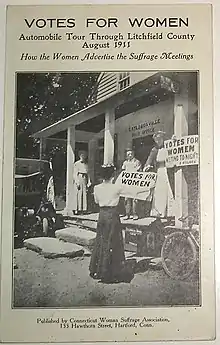 In 1909, at time of a nationwide upsurge in the women's suffrage movement, Katharine Houghton Hepburn (mother of Academy Award winning actress Katharine Hepburn) co-founded the Hartford Equal Suffrage League. In 1910, that organization merged with the CWSA, and Hepburn became its president.[87] Imbued with new energy, the CWSA sponsored a month-long automobile tour in 1911 that established a number of new local chapters. In 1914, it was the main organizer of the state's first suffrage parade, with 2000 participants. By 1917, the organization had 32,000 members.[86]