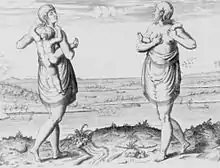 Exploitation of South America and the Caribbean preceded that of the North American continent.[25] In the earliest period, individuals were put ashore to explore areas, learn the language and customs and prepare to be translators and guides for later expeditioners. These explorers were encouraged to intermarry with indigenous women to strengthen and legitimize claims of power and territory.[27] Violent contact followed, wherein indigenous people resisted and were either subjugated or brought to extinction by adventurers seeking riches and glory.[28] Church functionaries were brought with troops to serve as administrators to the crown and serve as social control agents.[29] Spanish and Portuguese missionaries strongly opposed sexual behaviors, including adultery, polygamy, premarital sex, as well as nudity, which were tolerated by some native populations. They sought to have women cover themselves, accept Christian marriage and become maternal, domestic caretakers[25] and yet at the same time, the invading military forces sexually abused and seized women forcing them into concubinage.[30] Equally, officially hostile to Two-Spirit sexual practices, Europeans used gender-variant native people to service their own needs.[31] Violence was tolerated, and in some instances encouraged by priests, to tame women, keep them from sin, and to keep them obedient to their husbands.[32] Iberian women did not arrive in the New World until battles had been won and towns and cities had been established. Thirty Spanish women were allowed to participate in Columbus' third voyage of 1498 if they were willing to become permanent inhabitants of the Spanish colony. The intent of allowing women passage was that they would marry and bring morality to the colonies, as well as being able to convince other high-born women of the wealth to be had by emigration.[33] Spain's intent was to integrate the people they conquered into Spanish society and impose Iberian cultural and religious beliefs upon their new territories.[34] Sometimes indigenous cultures would facilitate integration, such as the Inca in Peru who gave Incan women to the Spanish men as gifts and brides.[35]