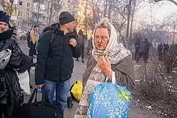 Women have been targeted with sexual violence in the invasion.[40][41][42] Ukrainian MPs Lesia Vasylenko, Alyona Shkrum, Maria Mezentseva, and Olena Khomenko stated that most elderly women in Russian-occupied cities "were executed after being raped or took their own lives."[43] Due to the limited communication with areas under Russian control or contested areas under heavy fighting the exact number of sexual violence cases have been difficult to track or respond to in a timely manner. The president of La Strada Ukraine; a charity supporting survivors of trafficking, domestic violence and sexual assault, stated their emergency hotline has had several calls for assistance from women and girls but due to the fighting the charity cannot help them physically. Reports of gang rapes, assaults at gunpoint and sexual violence in front of children have all been reported to Ukrainian and international authorities and law enforcement and media personnel as Russian troops have withdrawn.[44] Female villagers were warned to make themselves look unattractive by removing jewellery, donning headscarves and dressing as old women.[45]