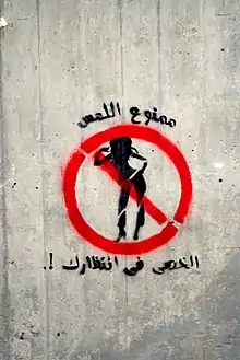 In spite of the great proliferation of protest graffiti during the January 25 revolution, it remained a largely male space, with men dominating the street artist community and very few pieces depicting women.[14] To counter this, movements such as the Graffiti Harimi project (the predecessor of Women on Walls) sought to increase the visibility of women in the public space by increasing the number of female figures in graffiti, with the intention of proving that women are worthy partners in the revolution. Female street art also serves the purpose of spreading political statements against the abuse of women. One recent denizen of the female graffiti scene supported by Women on Walls is Laila Ajjawi, who has garnered international press[15][16] for her activities in the UNRWA-run Palestinian refugee camp outside of Irbid, Jordan.[7]:133