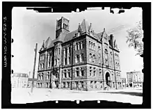 The Wood County Courthouse is a public building in downtown Parkersburg, West Virginia, in the United States.[2] The courthouse was built in 1899 at a cost of $100,000 in the Richardsonian Romanesque style by local contractors Caldwell & Drake, according to the plans of architect L. W. Thomas of Canton, Ohio.[3] The current courthouse is the fifth to be built in the county replacing one built in 1860. It was added to the National Register of Historic Places in 1979 for its architectural significance.[1] During his 1912 presidential campaign Theodore Roosevelt stopped in Parkersburg and spoke from the Market street entrance of the courthouse. On 2 July 2020 a new steeple was added to the bell tower replacing one that had been removed in 1952. With the new steeple the courthouse is now the tallest in the state at 164 ft.[4]