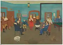 Gaylor was born in Stamford, Connecticut, on October 7, 1883. His birth name was Samuel Wood Gaylor, Jr.[49] His parents were Samuel Wood Gaylor, Sr. (born 1853), and Margaret Cecilia (McLean) Gaylor (born 1858).[5][7] Gaylor's father ran a sequence of saloons, inns, and rooming houses along the Connecticut shore and in Manhattan.[6][7][50][51] Gaylor had a sister, Mabel (born about 1886).[52] "Steven's Point" (shown at left) depicts himself with his father, mother, and sister in a shoreline barroom of a hotel that his father managed in 1888. Painted in 1929, it shows Gaylor holding a duck by its feet. He stands to the left of his mother. Mabel is standing on her right. His father stands behind the bar at far left. The viewer seems to be placed in an open doorway with a floor mat at his or her feet and there is water on the floor that, together with the hot stove in the center of the room, suggests cold and wet weather. At that time, Steven’s Point was a lonely maritime outpost on the Connecticut panhandle near Darien.[6] By the time he was 16, Gaylor's family had moved to Manhattan. He had left school and was working as an office boy while living at home.[7]