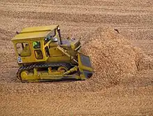 A bulldozer working the woodchip pile at Port Chalmers