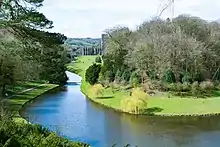 Horace Walpole, a great promoter of the English landscape garden style, praised Painshill in Surrey, whose varied features included a shrubbery with American plants, and a sloping "Alpine Valley" of conifers, as one of the best of the new style of "forest or savage gardens".[15] This was a style of woodland aiming at the sublime, a newly-fashionable concept in literature and the arts. It really required steep slopes, even if not very high, along which paths could be made revealing dramatic views, by which contemporary viewers who had read Gothic novels like Walpole's The Castle of Otranto (1764) were very ready to be impressed.[16] The appropriate style of garden buildings was Gothic rather than Neoclassical, and exotic planting was more likely to be evergreen conifers rather than flowering plants, replacing "the charm of bright, pleasant scenery in favour of the dark and rugged, gloomy and dramatic".[17] A leading example of the style was Studley Royal in North Yorkshire, which had the great advantage, at what was known as "The Surprise View", of suddenly revealing a distant view from above of the impressive ruins of Fountains Abbey.[18]