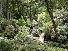 The steep garden at Cragside in Northumberland, created from the 1860s until about 1880, "may be regarded as the pioneering example" of this type of woodland garden, copied by several other gardens in the next three decades.[34] The very large areas of garden developed by the rich in the early 20th century therefore used relatively cheap land, that was often already woodland. Some woodland gardens, like Sheffield Park Garden in East Sussex, took over a park laid out in the 18th-century English landscape garden style, in that case worked on by both Capability Brown and Humphry Repton.[35] They also needed fewer gardeners per acre than intensive formal Victorian plantings. The style spread from the rich to the comfortably-off suburban middle-class.[36] According to Charles Quest-Ritson, "The William Robinson style of woodland garden, colourfully planted with exotic shrubs and herbaceous plants, dominated English horticulture from 1910 to 1960".[37]
