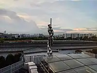 A 15-metre (49 ft) high stainless steel by Min Chen is displayed at the NSL station.[30] The sculpture, Faces II, is a spiral of triangular geometric surfaces, intended to represent the various expressions of people's faces.[37] Selected among six submissions, the judges were impressed by the artist's ability to “incorporate a human feel” in a cubist style. The sculpture takes inspiration from origami, the Japanese art of paper folding. The judges hoped that the work would reflect Singapore's Asian background.[38]