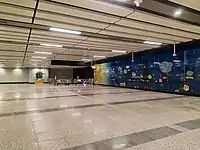 Terence Lin's The Day’s Thoughts Of A Homespun Journey Into The Night is displayed on two walls of the TEL station interior.[39] The artwork contains illustrations of various public transport vehicles,[39] with the commuters' thoughts and aspirations illuminated by the vehicles' headlights.[40] Keeping to the theme of transit most associated with Woodlands, the artwork intends to illustrate the everyday commuting experiences in an imaginative way. Through the artwork, the artist hoped that people would be more aware of what they do in transit[39] while reminding them of their own home.[40]