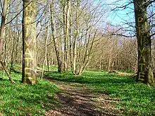 The Alders woods (TQ 229 154), known locally as the "Bluebell Wood", are mostly wet carr, but are carpeted by Bluebells on the northern rising ground. On the east side of The Alders was a small but lovely marsh (TQ 230 154) with heath spotted orchid, marsh cinquefoil, narrow buckler fern and water purslane. More recently it has become overgrown with Bramble and young saplings and the Rampion Wind Farm cable runs along its eastern edge.[5]:173