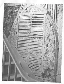 In the back garden of the house is a red sandstone building, cobbled inside, which was used latterly as the woodshed and fuel store (paraffin, diesel, etc.) A collapsed stable lay to the right-hand side as viewed from the front. The floor was lined with bricks with a central drainage channel and drain. This building had been two stories high and was probably used for the farm horses, the coach or "trap" horses, usually hackneys[4] being kept in the stable off from the central courtyard of the old farm buildings. Near the old greenhouse in the back garden was an "apple rack" with several drawers for storing the crop from the orchard. This apple rack was used until the 1970s when the structure became unsound and was not replaced. The rack can be seen in the drawing illustrated here.