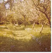 An old orchard with twenty or so trees was complemented by a new orchard planted in the late 1960s. A wide variety of cooking and eating apples were joined by pear tree varieties, cherries and plums. The flora of the old orchard sward was dominated by primroses and violets.