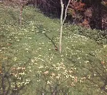 Detailed plans of these primroses were plotted yearly in the 1970s to show the change in distribution. In addition to the wild type, white, red, pink and multi-headed varieties grew here. Green alkanet (Pentaglottis sempervirens) grew here, together with black bryony, flowering currant, horseradish, butcher's broom (Ruscus aculeatus), bluebells (blue, pink and white), Aquilegia and other several other species.