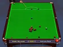 The game features Career, Quick Play and Trickshot modes. The game also includes eight-ball, nine-ball, and blackball pool. For a series first, the game also allows players to play Snooker online, via a modem.[1] There is also the option to create your own custom tournaments for play against the AI, or another player.[2] In Career mode, the player starts as a new member of the World Snooker Tour, and earns ranking points by winning matches and tournaments. Similar to real life, certain competitions are only available at a certain ranking (such as The Masters), and at lower rankings the player has to qualify for tournaments such as the World Snooker Championships, and the UK Open.