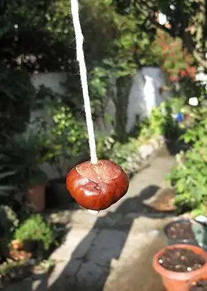 The World Conker Championships (WCC) is a conkers tournament held annually on the second Sunday in October[1] in the county of Northamptonshire, England. Two players use conkers threaded onto a string and take turns to strike the other's nut until it shatters.[2] Players from around the world enter the tournament, competing in a knock-out format in both team and individual formats, with titles for men's, women's and youth categories. Up to 5,000 spectators watch around 400 players participating.[3] from many countries, including Australia, Austria, Canada, France, Japan, Mexico, New Zealand, Poland, Russia, South Africa, Sri Lanka, Ukraine, the United States and the United Kingdom.[4][5][6][7][8]