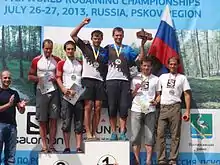 World Rogaining Championships 2013 Men's Open winners. From left: Rait Pallo, Timmo Tammemäe – silver (Estonia), Rain Eensaar, Silver Eensaar – gold (Estonia), Oleg Kalinin, Evgeny Dombrovskiy – bronze (Russia)