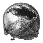 A skull, found during Dymond's second exploration, which is gouged with many cuts from an edged weapon. (Drawn in 1886 for Dymond's book, Worlebury:An Ancient Stronghold in the County of Somerset.)