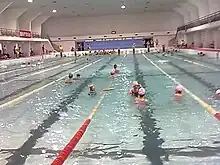 WIPE's indoor swimming pool, constructed in 1984[8] and put into service since 1986, is a combination of public and competition pool. The pool is maintained in constant temperature. It was then the largest swimming pool in China equipped with solar heating system, which were able to heat 70 tons of hot water daily according to its original design.[8][9] Affiliated to and overseen by teaching and researching section of swimming in WIPE, the Swimming pool have been run by a private contractor.,[10] especially in summer. Athletes here have competed in different level of swimming event as well as less publicized fin swimming competition, having attained phenomenal accomplishments such as 10 world champions. There were 6 world records, 4 Asian records and 5 national records kept here.[11]