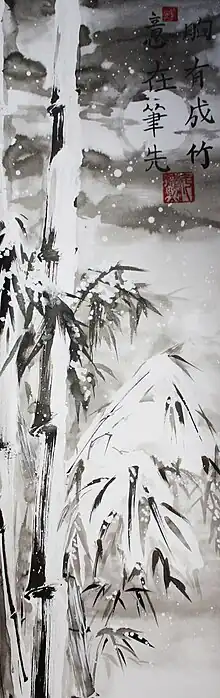 Wuxing painting is a style of Chinese painting that draws inspiration from the philosophical concept of the "five phases/elements" (wuxing). Specifically, it combines the use of Chinese freehand brush work techniques and the metaphysics of the five wuxing elements.[1] Wuxing painting also inherited some traits from several wushu and qigong schools of Chinese martial arts. The closest martial art in style is xingyiquan, whose 5 primary movements are balanced with the 5 elements of wuxing. Because wuxing painting techniques are associated foremost with consciousness and overcoming corporeal restraints, it is common to speak of the manifest art therapy influence of this method.