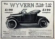 Wyvern Light Car Co.Ltd. was a British automobile manufacturer which traded from 1913–1914 in Twickenham, then in Middlesex (now a part of London). The cyclecar was powered by a four-cylinder, in-line, 10.53 hp. Chapuis-Dornier engine driving the rear wheels.[1]