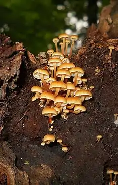 Xeromphalina kauffmanii fruits in dense groups or clusters on rotting hardwood logs and stumps. Fruiting occurs from summer to autumn in eastern North America. The fungus has also been recorded from Costa Rica and Japan.[2]