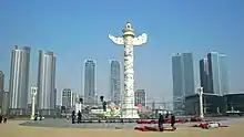 A huabiao was once located at the center of the square.[5] It was first built in 1997 to commemorate the handover of Hong Kong. It was the tallest huabiao in China, and became one of the landmarks and symbols of Dalian. It stood at a height of 19.97 meters, and had a diameter of 1.997 metres. It was demolished secretly on August 5, 2016, at midnight, which was believed to be out of political reasons related to the downfall of Chinese politician Bo Xilai, who oversaw the construction of Xinghai Square and the central huabiao during his tenure as the mayor of Dalian. Local media remained in silence about this, and reports by mainland media were soon deleted.[6]
