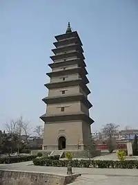The pagoda has nine tiers of eaves and a crowning spire, along with artwork of stone carvings at the corners of the stone platform that makes up its base. The interior of the pagoda is hollow and lacks a staircase to reach the higher floors. Its style of eaves in gradual tiers resembles that of other Tang pagodas, such as the Small Wild Goose and Giant Wild Goose pagodas. Near the arched doorway leading into the pagoda is a colossal stone body of a bixi, a Chinese mythical beast in the shape of a tortoise-like dragon.[1] The left side of the statue had been broken off and missing, until it was found in 2000, during an excavation at a nearby street.[1]
